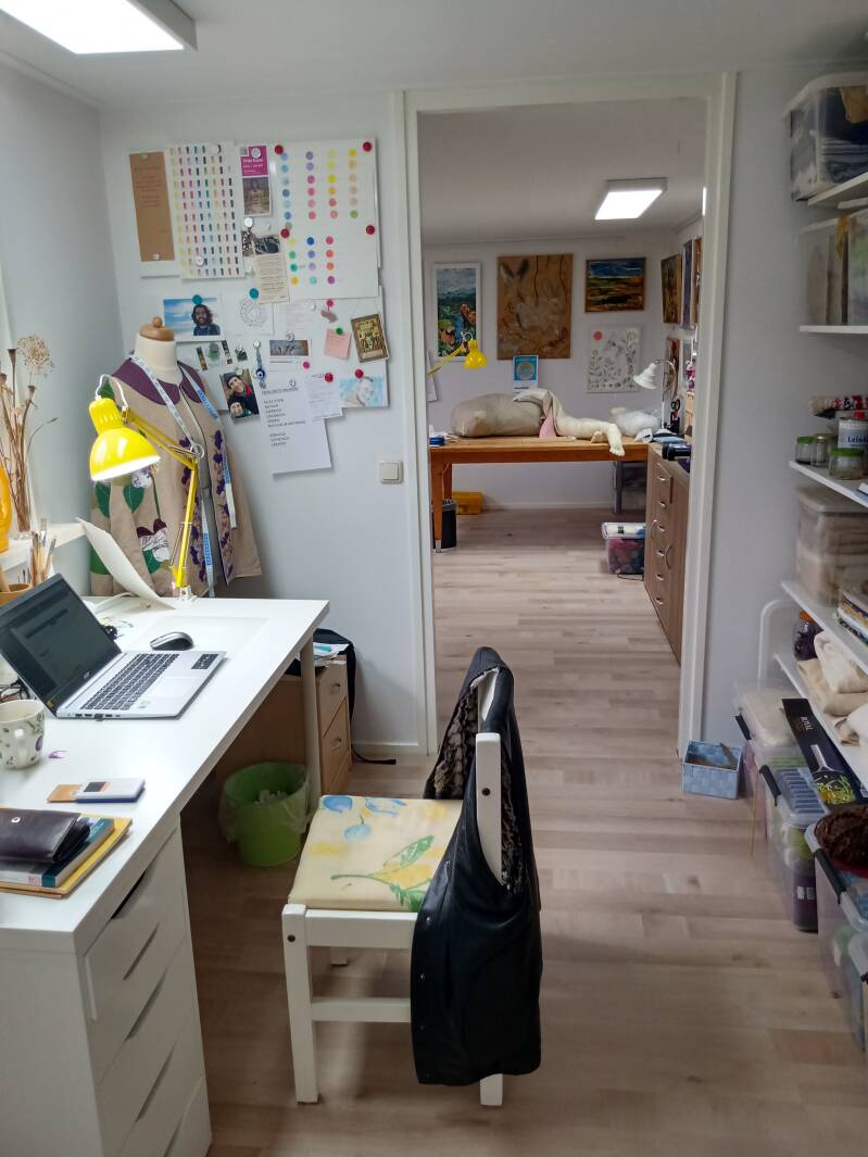 Ik heb nu de luxe van 3 bureaus zodat ik gemakkelijk tegelijkertijd aan meerdere projecten kan werken. In het grote atelier mag het stoffig en rommelig worden. Daar werk ik met textiel, hout en daar staat mijn breimachine. In mijn kleine atelier, waar ook mijn voorraad staat, probeer ik het wat schoner te houden. Daar werk ik achter mijn laptop, ben ik aan het tekenen of aquarelleren en schets ik ontwerpen.
